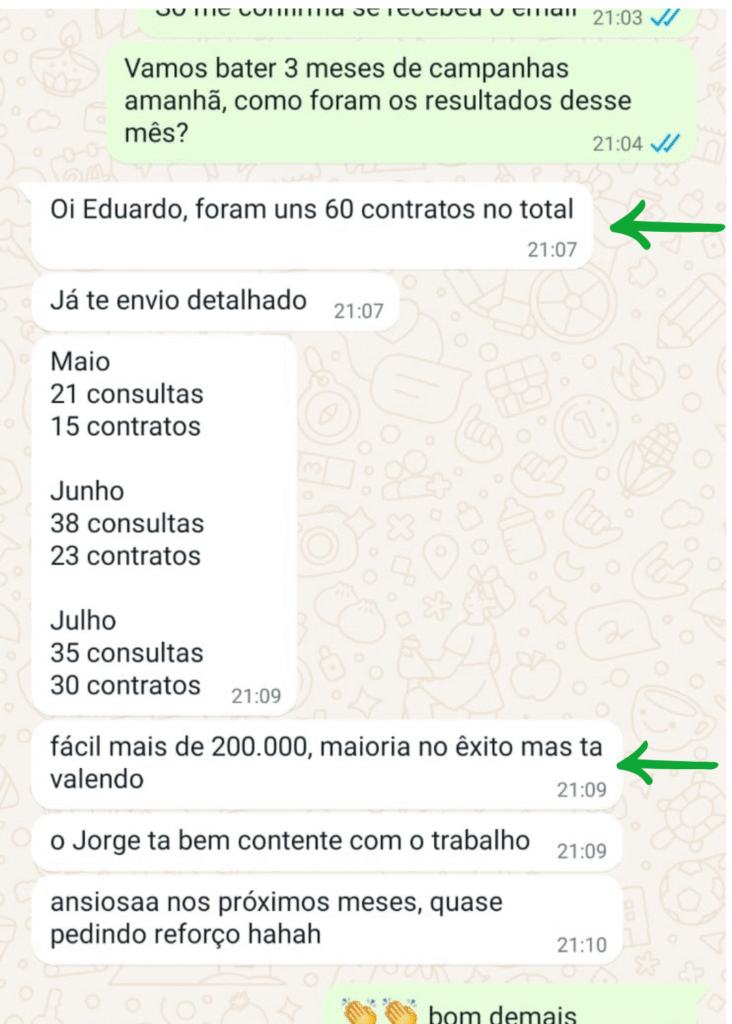 “Foram uns 60 contratos no total… fácil mais de 200.000… ansiosa nos próximos meses, quase pedindo reforço”